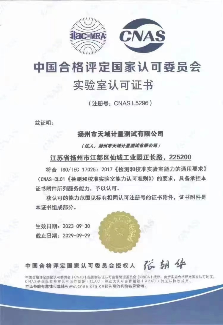 揚(yáng)州市天域計(jì)量測(cè)試有限公司,坐落在交通便利的揚(yáng)州市江都區(qū)仙城工業(yè)園,成立于2010年10月,2011年11月正式獲取中國合格評(píng)定國家認(rèn)可委員會(huì)認(rèn)可(授權(quán)),注冊(cè)號(hào):CNAS L5296。近幾年的發(fā)展,實(shí)驗(yàn)室已具備了較大規(guī)模,并形成了集計(jì)量器具檢測(cè),計(jì)量技術(shù)咨詢和計(jì)量器具銷售為一體的專業(yè)化技術(shù)機(jī)構(gòu),客戶覆蓋蘇南、蘇北、和浙江,安徽部分地區(qū),客戶群總量達(dá)到了上千家企事業(yè)單位。實(shí)驗(yàn)室建立健全了一套較為完整的內(nèi)外部質(zhì)量管理體系,至今未發(fā)生糾紛和客戶投訴事件。